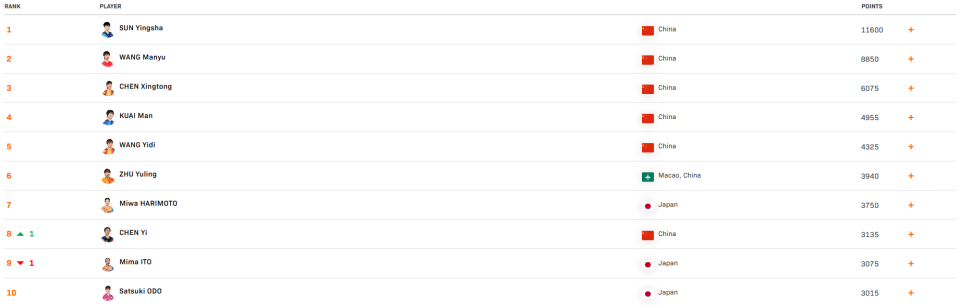 女单孙颖莎的积分更加惊人,达到了11600分。上周王楚钦积分破万之后,世界排名榜上首次出现了男女单榜首积分都突破1万的盛况。女单前五位都被中国选手占据,孙颖莎之后是王曼昱、陈幸同、蒯曼和王艺迪,代表中国澳门出战的朱雨玲排第六,张本美和位居第七。女单前十有一处变化,陈熠超越了伊藤美诚升至第八位,第十是日本的大藤沙月,前十中有多达6位中国选手。