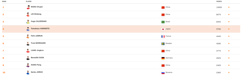 上周没有比赛,男单前十本周没有任何变化,4-10位是张本智和、小勒布伦、莫雷加德、梁靖崑、杜达、向鹏和约基奇。前十中有4位中国选手。